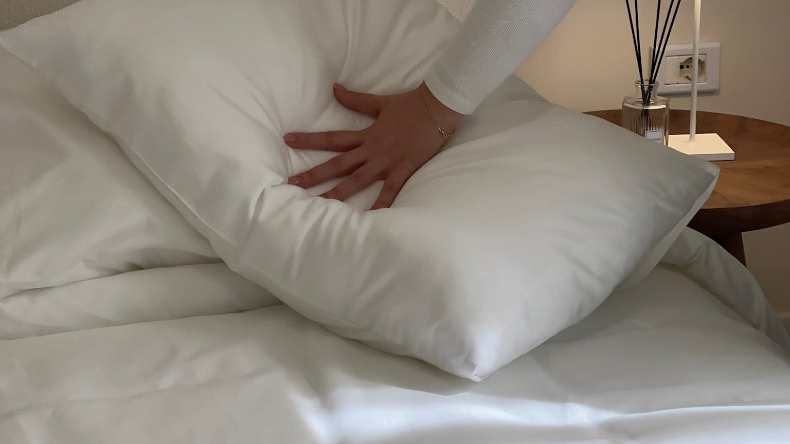 Bed with heart-patterned bedding in a room with a curtain. Percale